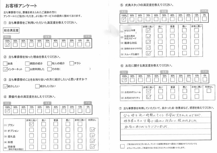 立ち華葬祭では、葬儀を終えられたご遺族の方にアンケートにご協力いただき、より良いサービスの提供に努めております。