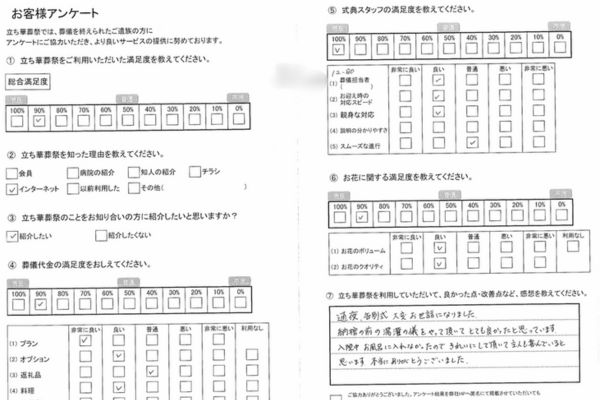 この度は、大切なご葬儀を立ち華葬祭にお任せいただき、誠にありがとうございました。また、アンケートへのご協力に心より感謝申し上げます。